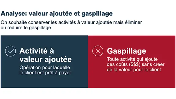 La production à valeur ajoutée est une importante occasion qui se cache dans la plupart des entreprises. En effet, 75 à 95 % du travail dans une entreprise type n’ajoute pas de valeur, mais augmente simplement les coûts, sans accroître la valeur pour la clientèle.